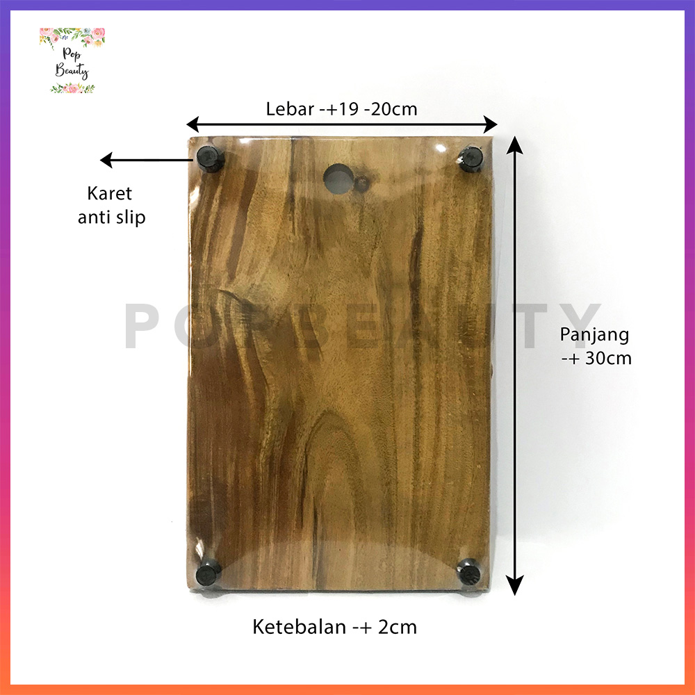 Talenan Akasia : ((+/- 19 cm-20 cm) x 30 cm x 2 cm; berat 1.500g, warna relatif gelap.